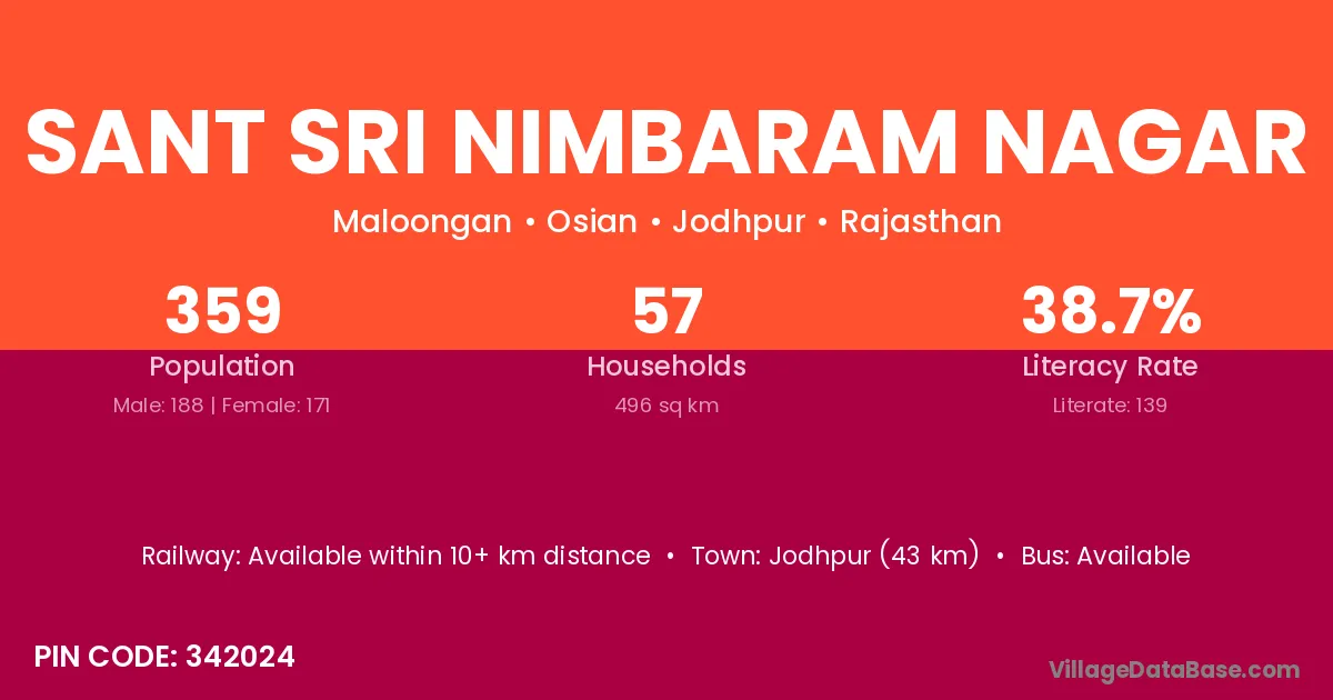 Sant Sri Nimbaram Nagar village has a total population of 359 people, of which 188 are males and 171 are females.