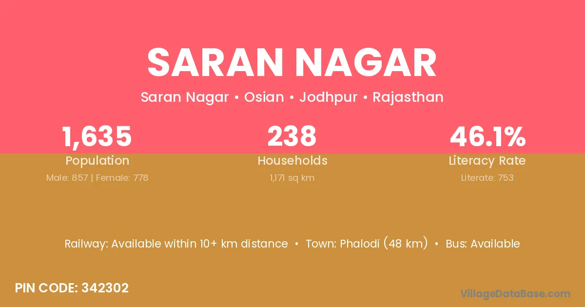 Phalodi (48 km) is the nearest town to Saran Nagar village for major economic activities and is located approximately 48 km away.