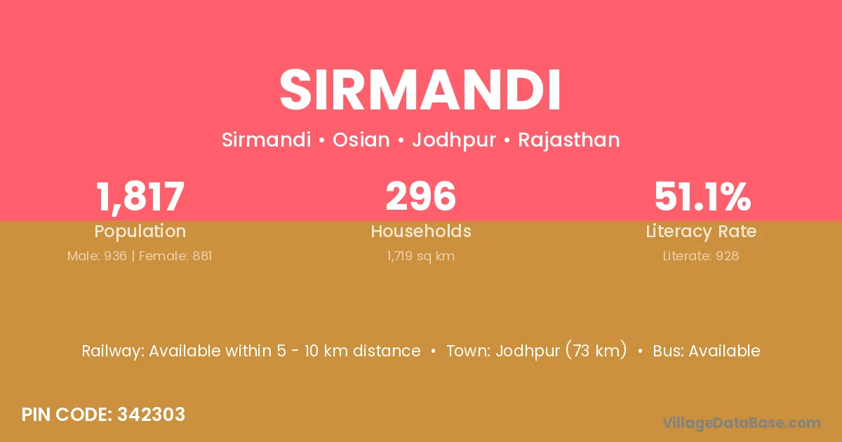 Jodhpur (73 km) is the nearest town to Sirmandi village for major economic activities and is located approximately 73 km away.