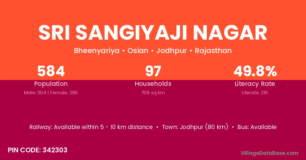 Jodhpur (80 km) is the nearest town to Sri Sangiyaji Nagar village for major economic activities and is located approximately 80 km away.