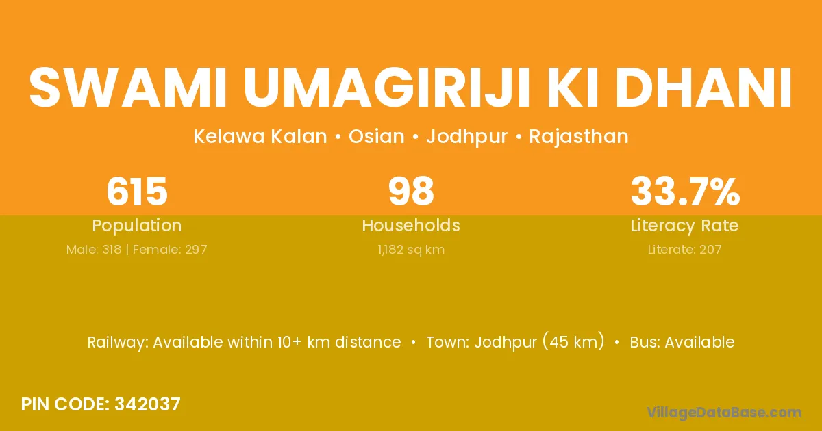 Swami Umagiriji Ki Dhani village has a total population of 615 people, of which 318 are males and 297 are females.