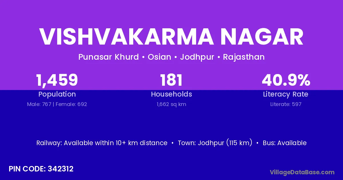 Jodhpur (115 km) is the nearest town to Vishvakarma Nagar village for major economic activities and is located approximately 115 km away.