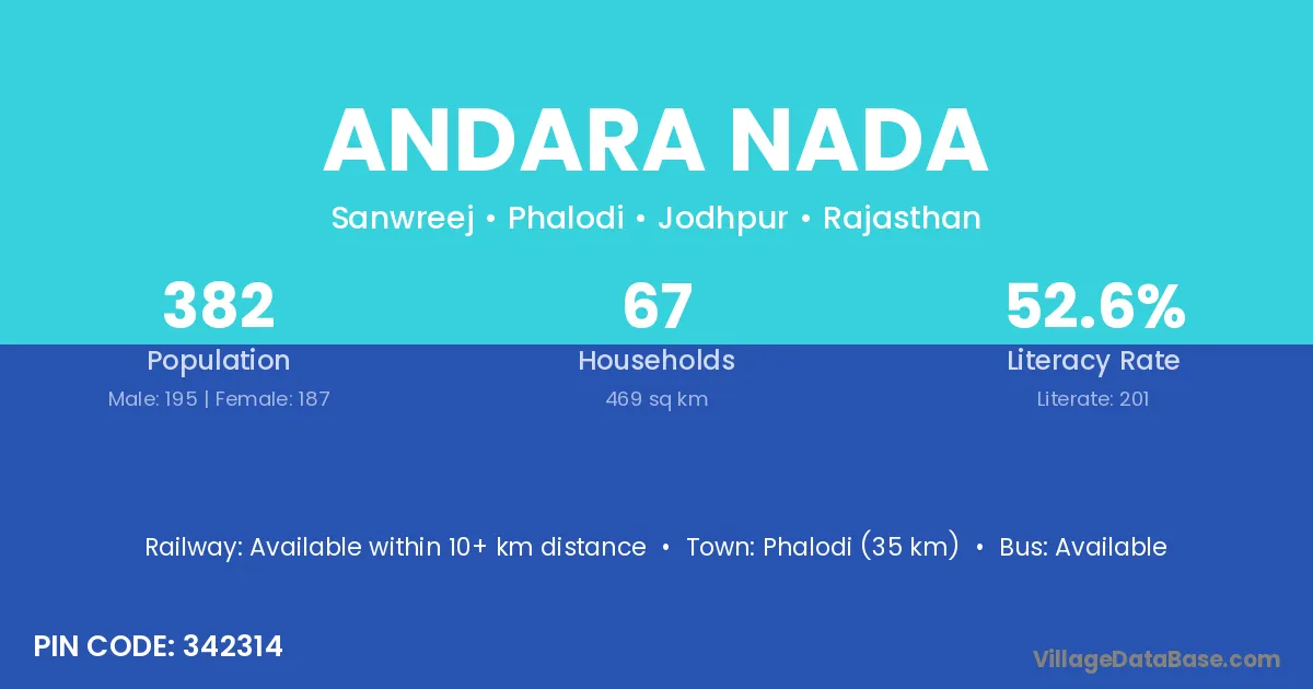 Phalodi (35 km) is the nearest town to Andara Nada village for major economic activities and is located approximately 35 km away.