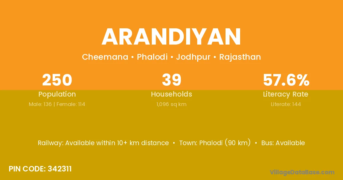 Phalodi (90 km) is the nearest town to Arandiyan village for major economic activities and is located approximately 90 km away.