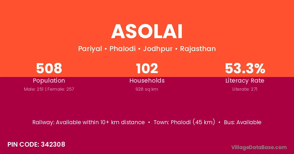 Phalodi (45 km) is the nearest town to Asolai village for major economic activities and is located approximately 45 km away.
