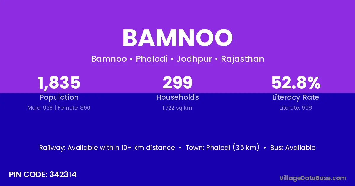 Phalodi (35 km) is the nearest town to Bamnoo village for major economic activities and is located approximately 35 km away.