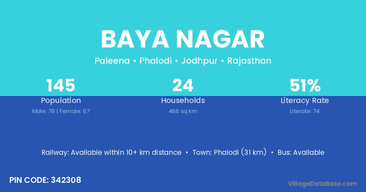 Phalodi (31 km) is the nearest town to Baya Nagar village for major economic activities and is located approximately 31 km away.