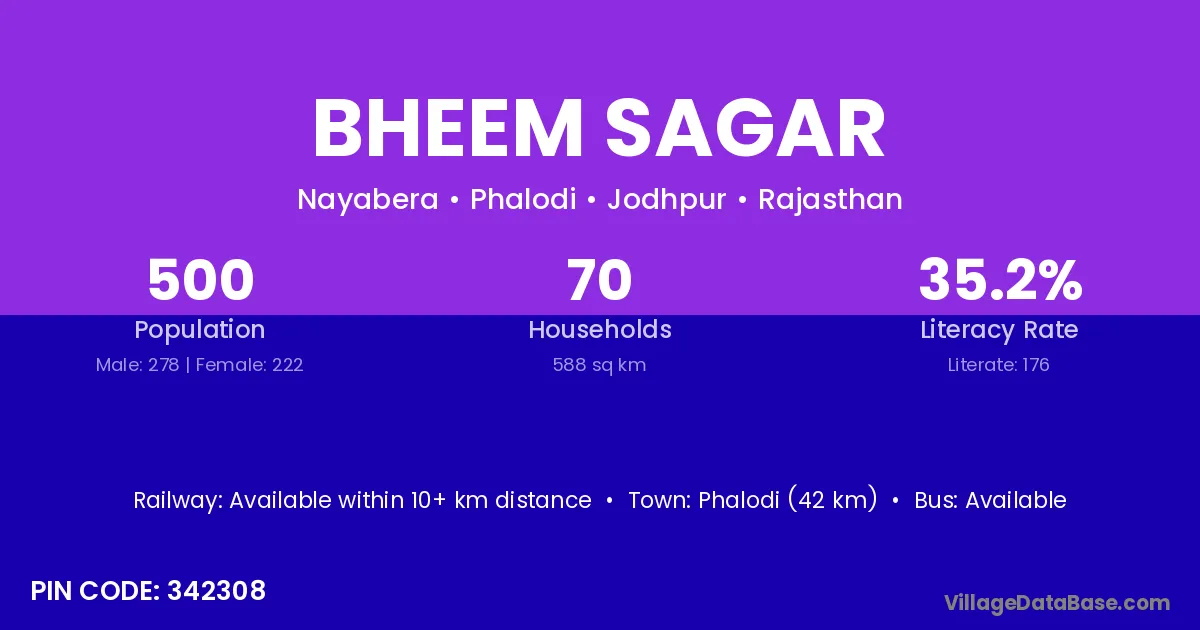 Phalodi (42 km) is the nearest town to Bheem Sagar village for major economic activities and is located approximately 42 km away.