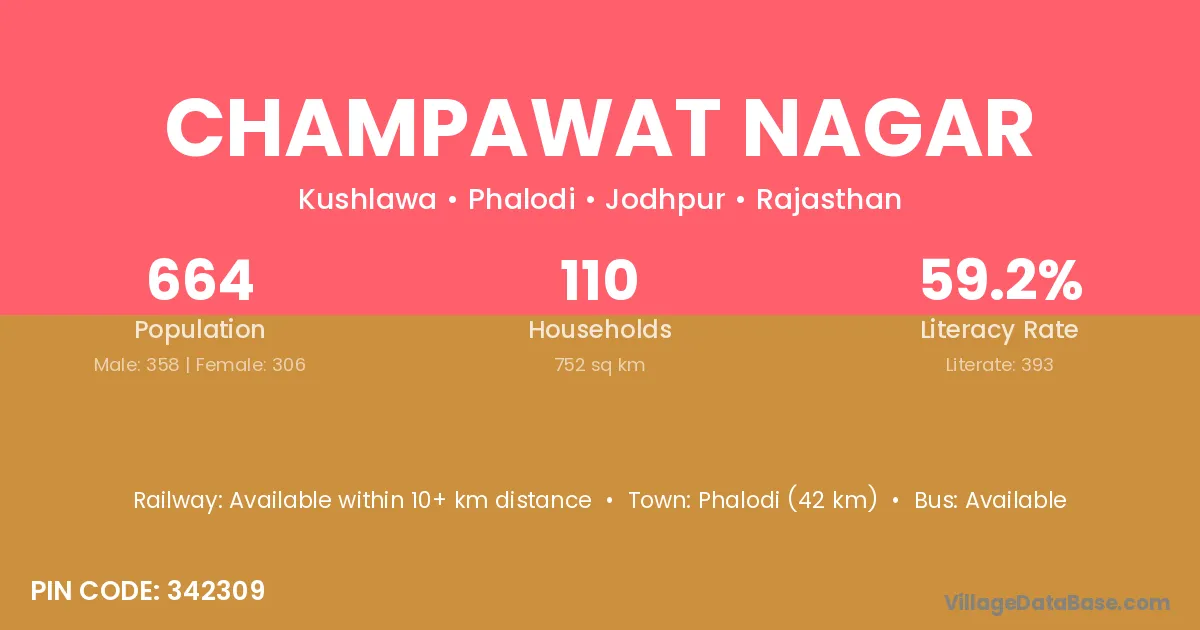 Phalodi (42 km) is the nearest town to Champawat Nagar village for major economic activities and is located approximately 42 km away.
