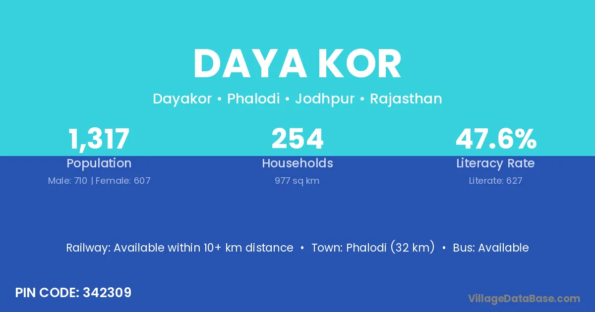 Phalodi (32 km) is the nearest town to Daya Kor village for major economic activities and is located approximately 32 km away.