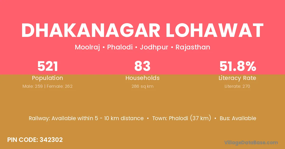 Phalodi (37 km) is the nearest town to Dhakanagar Lohawat village for major economic activities and is located approximately 37 km away.