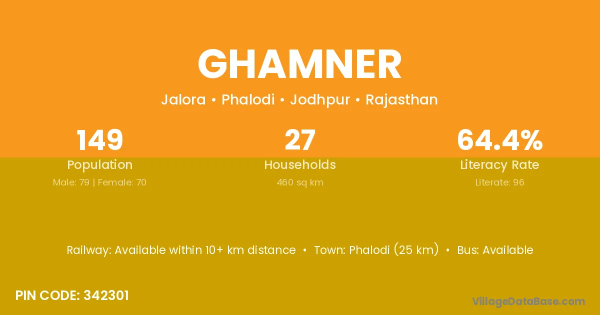 Phalodi (25 km) is the nearest town to Ghamner village for major economic activities and is located approximately 25 km away.