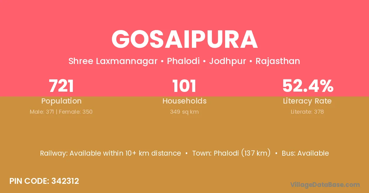 Phalodi (137 km) is the nearest town to Gosaipura village for major economic activities and is located approximately 137 km away.