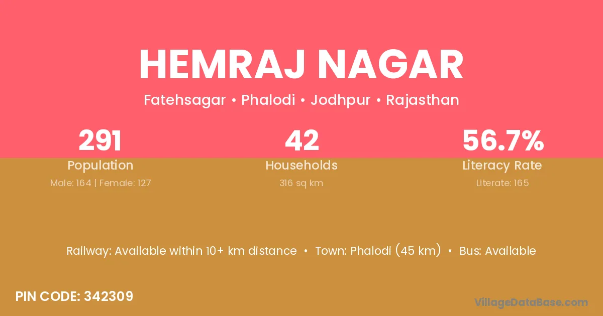 Phalodi (45 km) is the nearest town to Hemraj Nagar village for major economic activities and is located approximately 45 km away.
