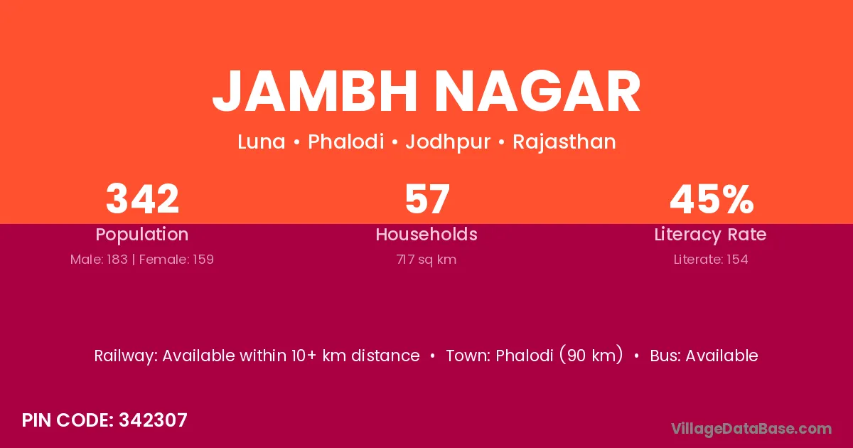 Phalodi (90 km) is the nearest town to Jambh Nagar village for major economic activities and is located approximately 90 km away.