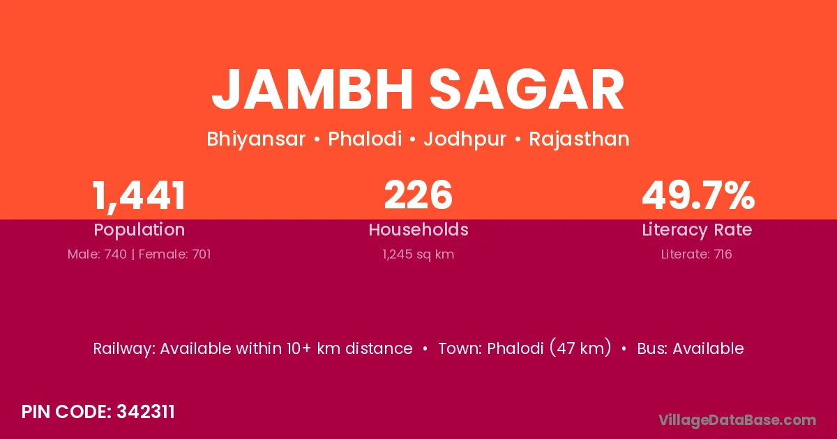 Phalodi (47 km) is the nearest town to Jambh Sagar village for major economic activities and is located approximately 47 km away.