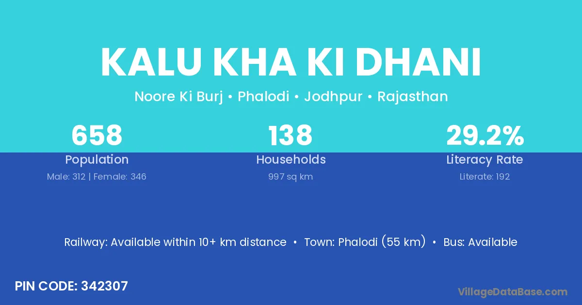 Kalu Kha Ki Dhani village has a total population of 658 people, of which 312 are males and 346 are females.