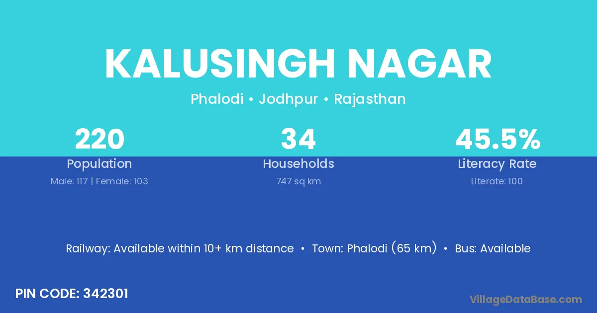 Phalodi (65 km) is the nearest town to Kalusingh Nagar village for major economic activities and is located approximately 65 km away.