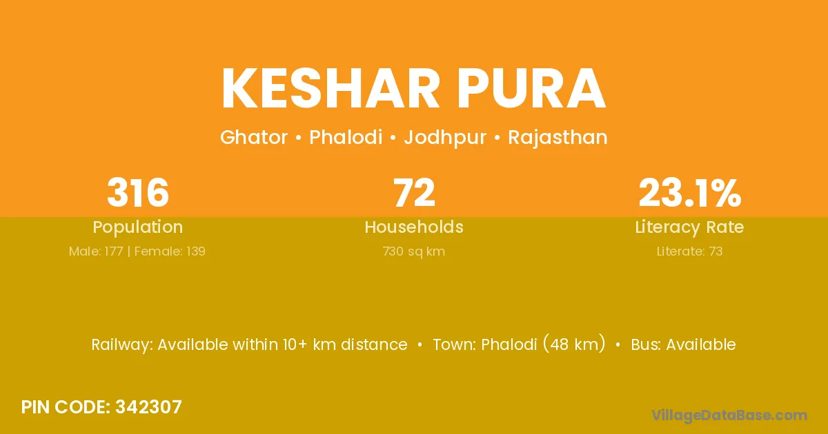 Phalodi (48 km) is the nearest town to Keshar Pura village for major economic activities and is located approximately 48 km away.