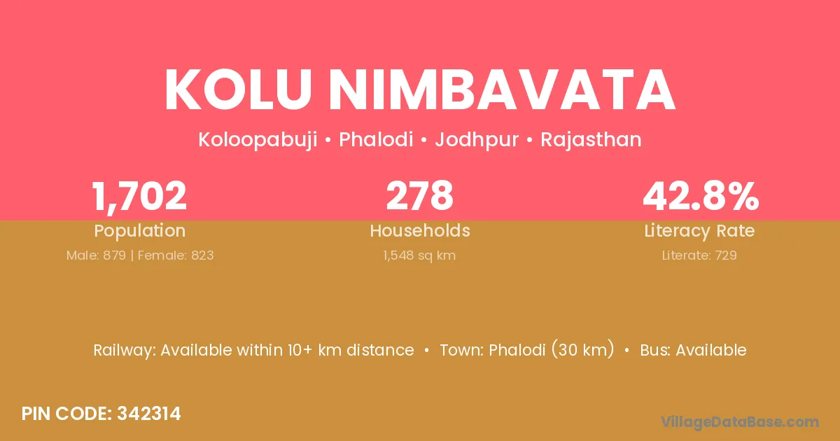 Phalodi (30 km) is the nearest town to Kolu Nimbavata village for major economic activities and is located approximately 30 km away.