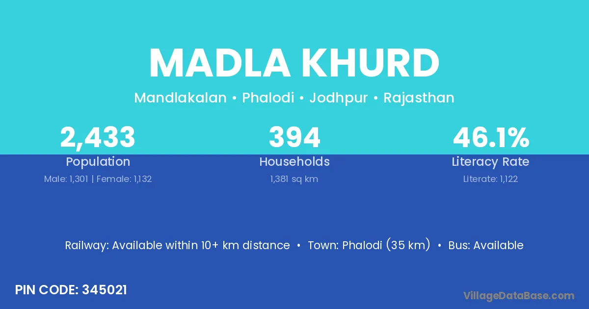 Phalodi (35 km) is the nearest town to Madla Khurd village for major economic activities and is located approximately 35 km away.