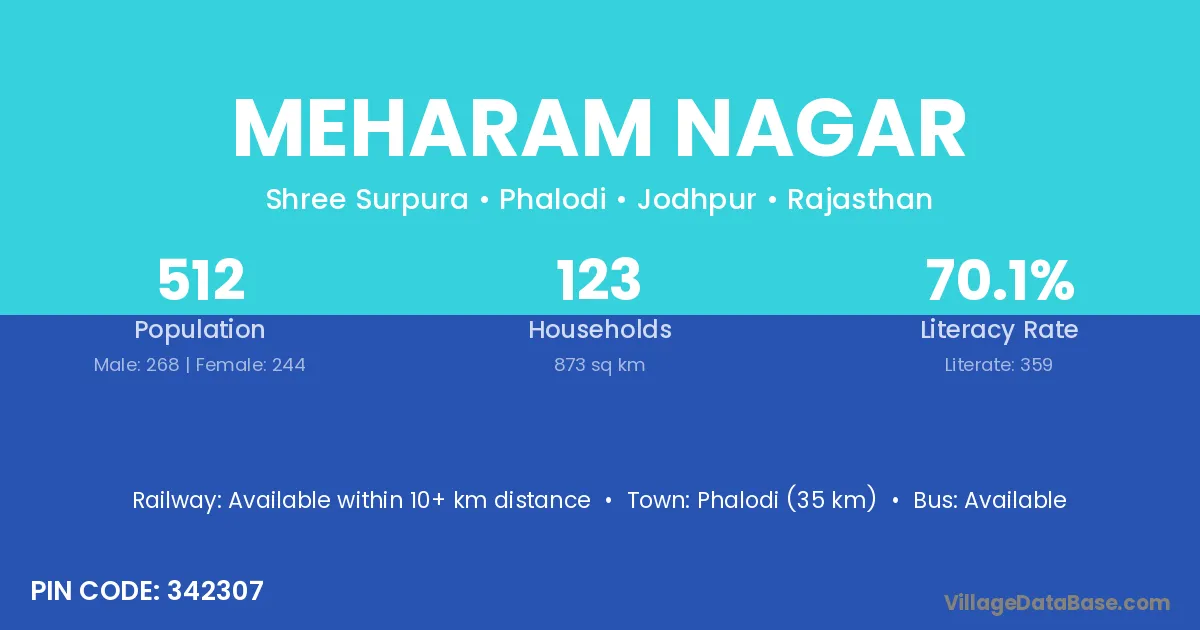 Phalodi (35 km) is the nearest town to Meharam Nagar village for major economic activities and is located approximately 35 km away.