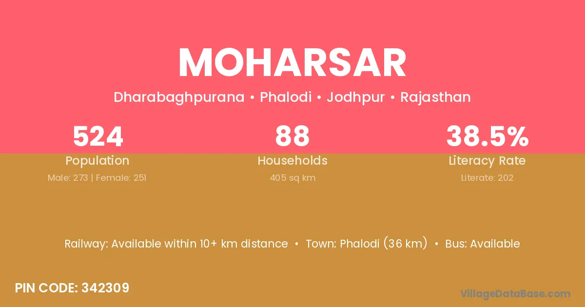 Phalodi (36 km) is the nearest town to Moharsar village for major economic activities and is located approximately 36 km away.