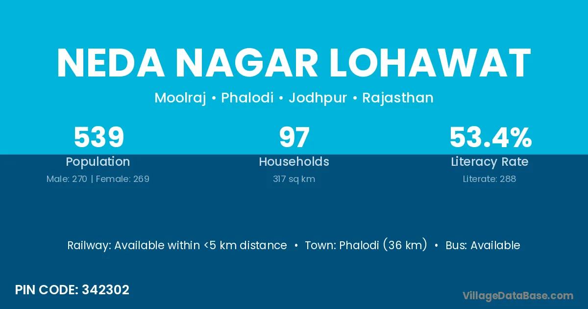 Phalodi (36 km) is the nearest town to Neda Nagar Lohawat village for major economic activities and is located approximately 36 km away.