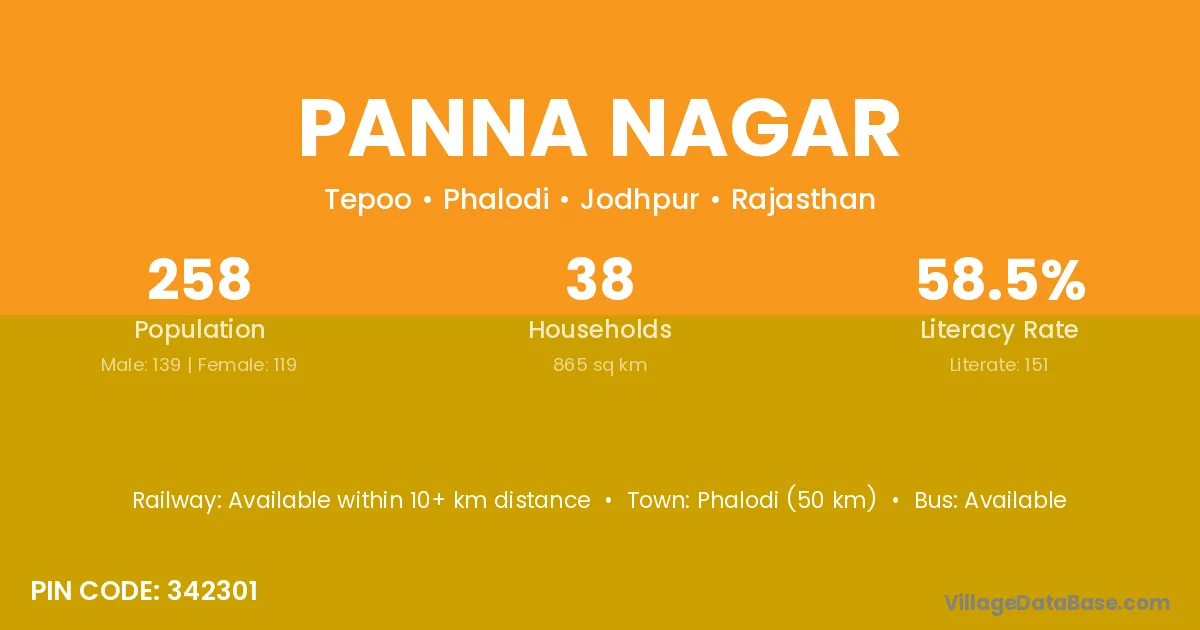 Phalodi (50 km) is the nearest town to Panna Nagar village for major economic activities and is located approximately 50 km away.