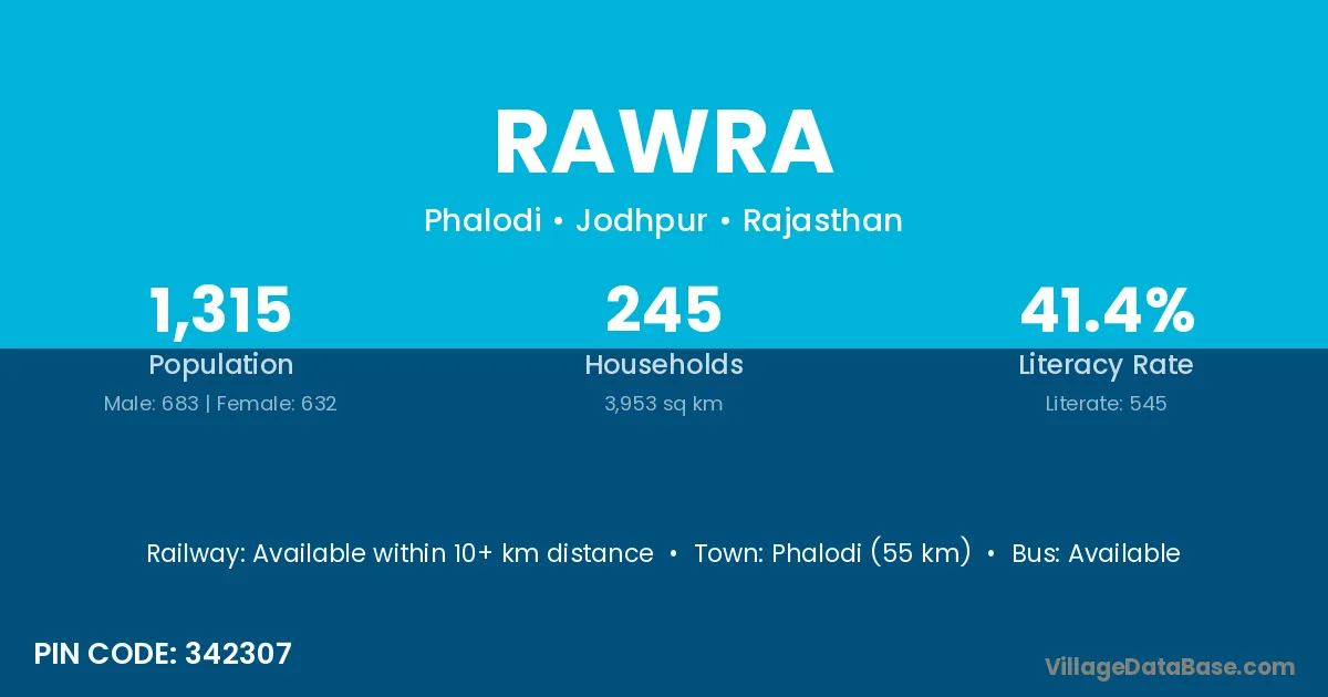 Phalodi (55 km) is the nearest town to Rawra village for major economic activities and is located approximately 55 km away.