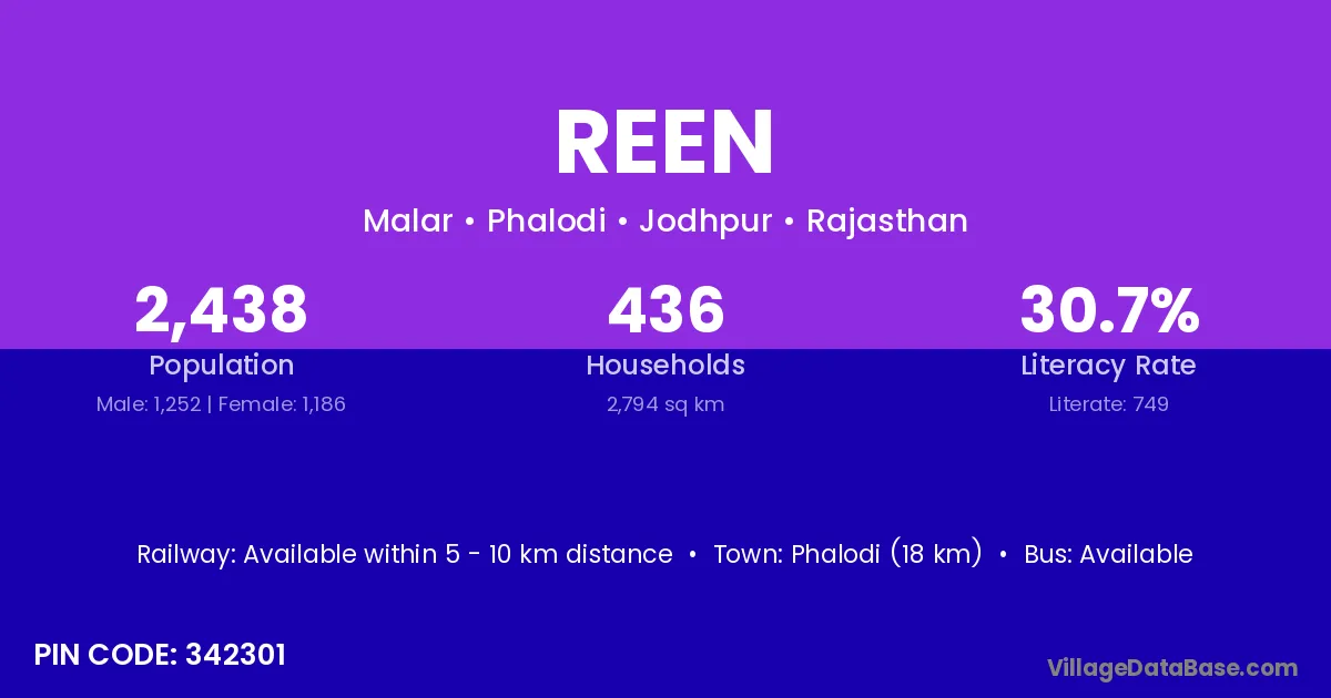Phalodi (18 km) is the nearest town to Reen village for major economic activities and is located approximately 18 km away.