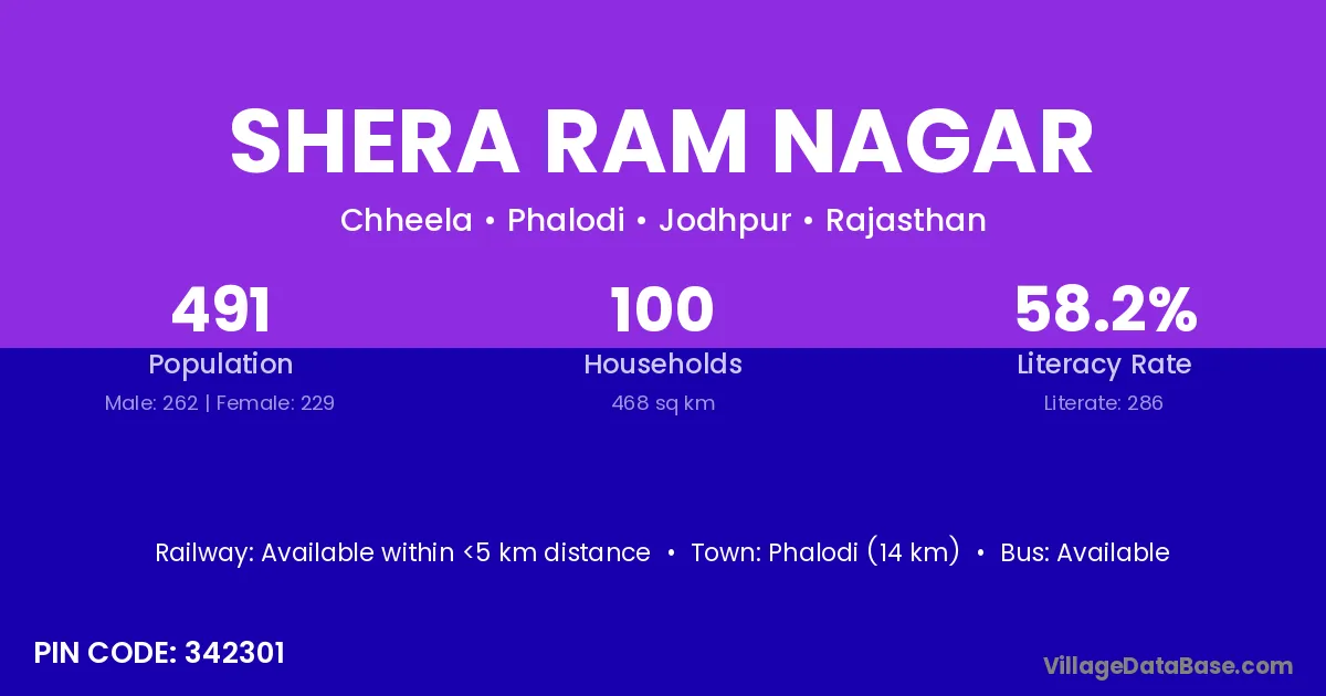 Phalodi (14 km) is the nearest town to Shera Ram Nagar village for major economic activities and is located approximately 14 km away.