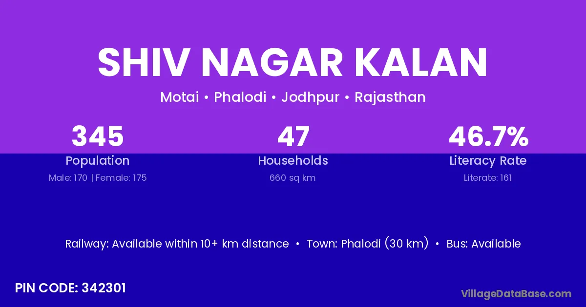 Phalodi (30 km) is the nearest town to Shiv Nagar Kalan village for major economic activities and is located approximately 30 km away.