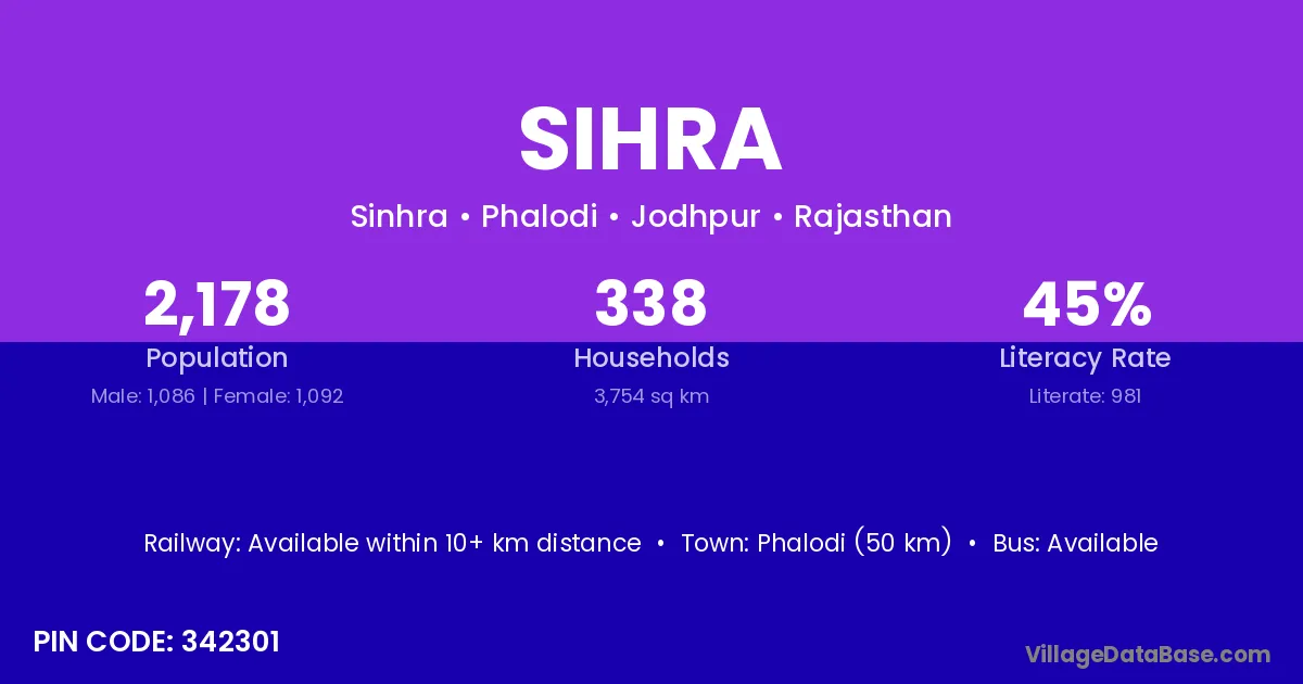 Phalodi (50 km) is the nearest town to Sihra village for major economic activities and is located approximately 50 km away.