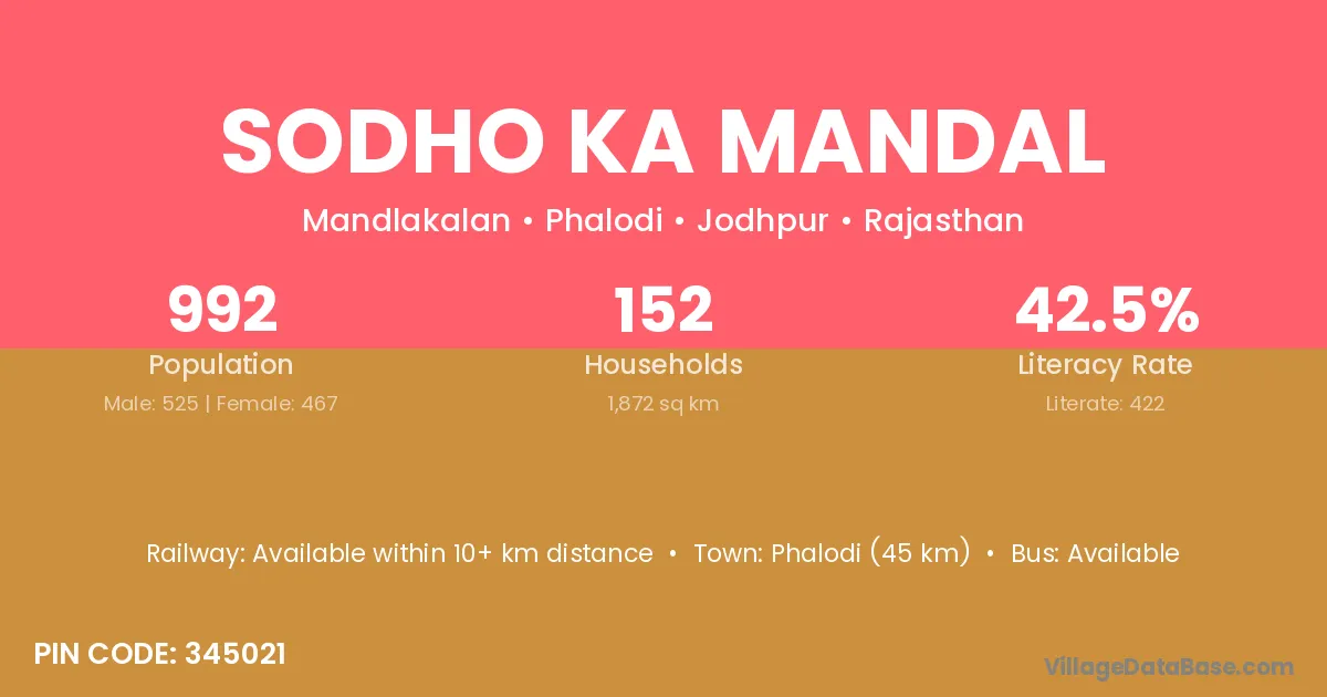 Sodho Ka Mandal village has a total population of 992 people, of which 525 are males and 467 are females.