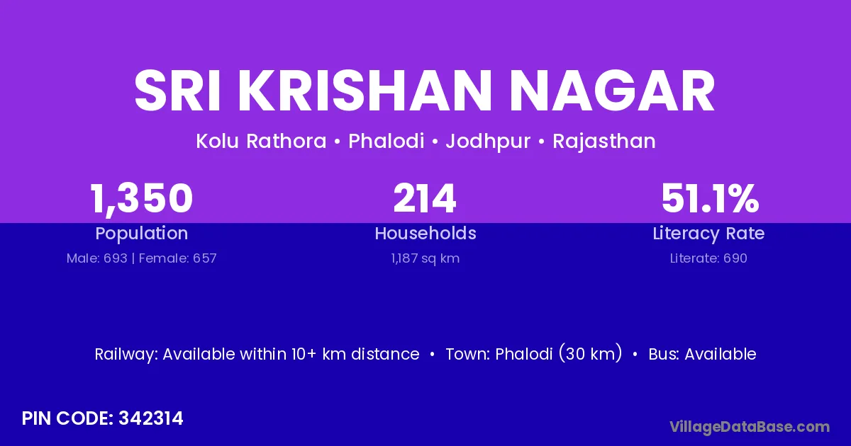 Phalodi (30 km) is the nearest town to Sri Krishan Nagar village for major economic activities and is located approximately 30 km away.