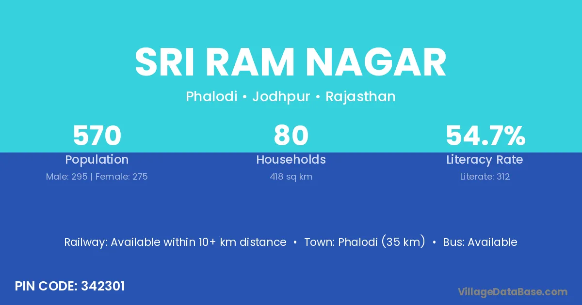 Phalodi (35 km) is the nearest town to Sri Ram Nagar village for major economic activities and is located approximately 35 km away.
