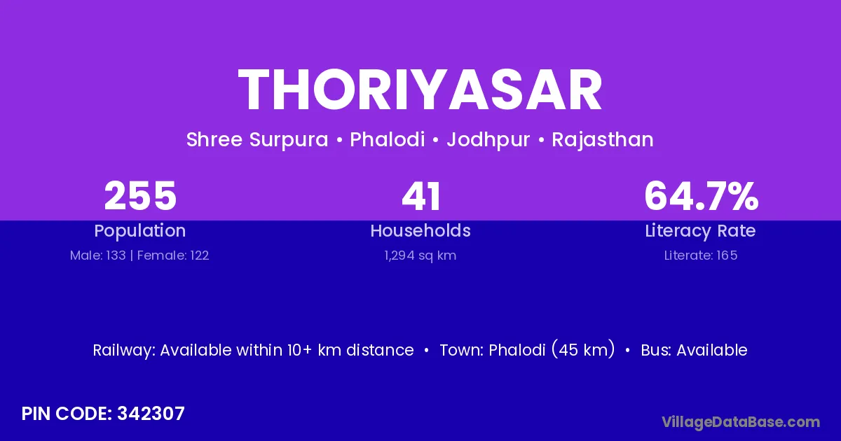 Phalodi (45 km) is the nearest town to Thoriyasar village for major economic activities and is located approximately 45 km away.