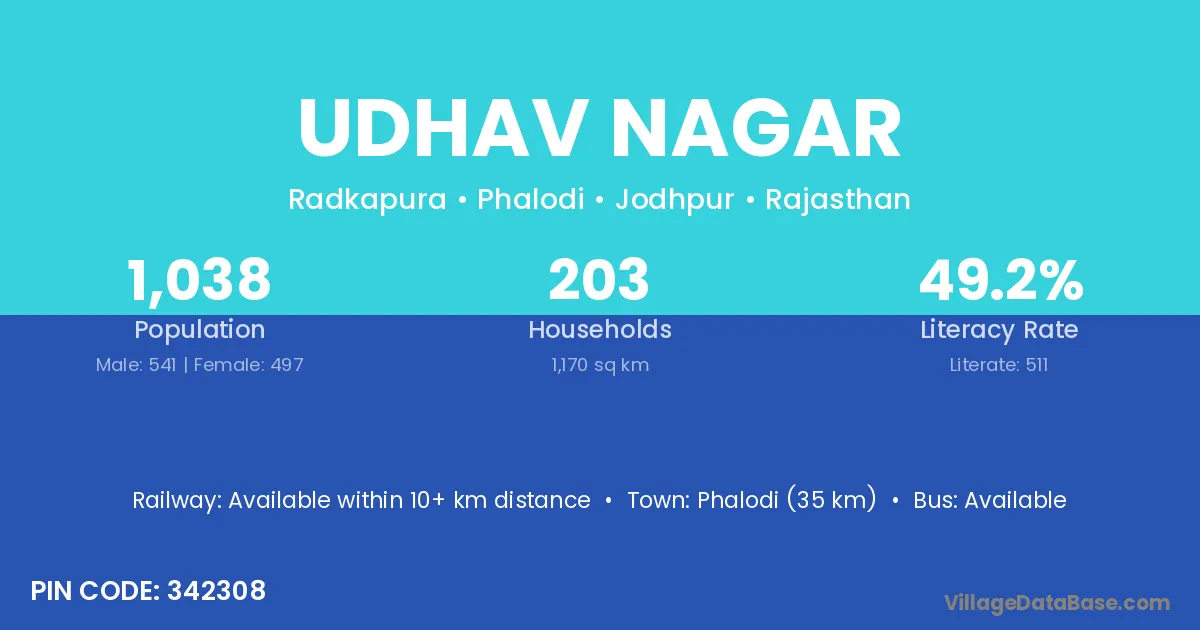 Phalodi (35 km) is the nearest town to Udhav Nagar village for major economic activities and is located approximately 35 km away.