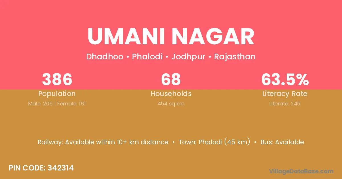 Phalodi (45 km) is the nearest town to Umani Nagar village for major economic activities and is located approximately 45 km away.