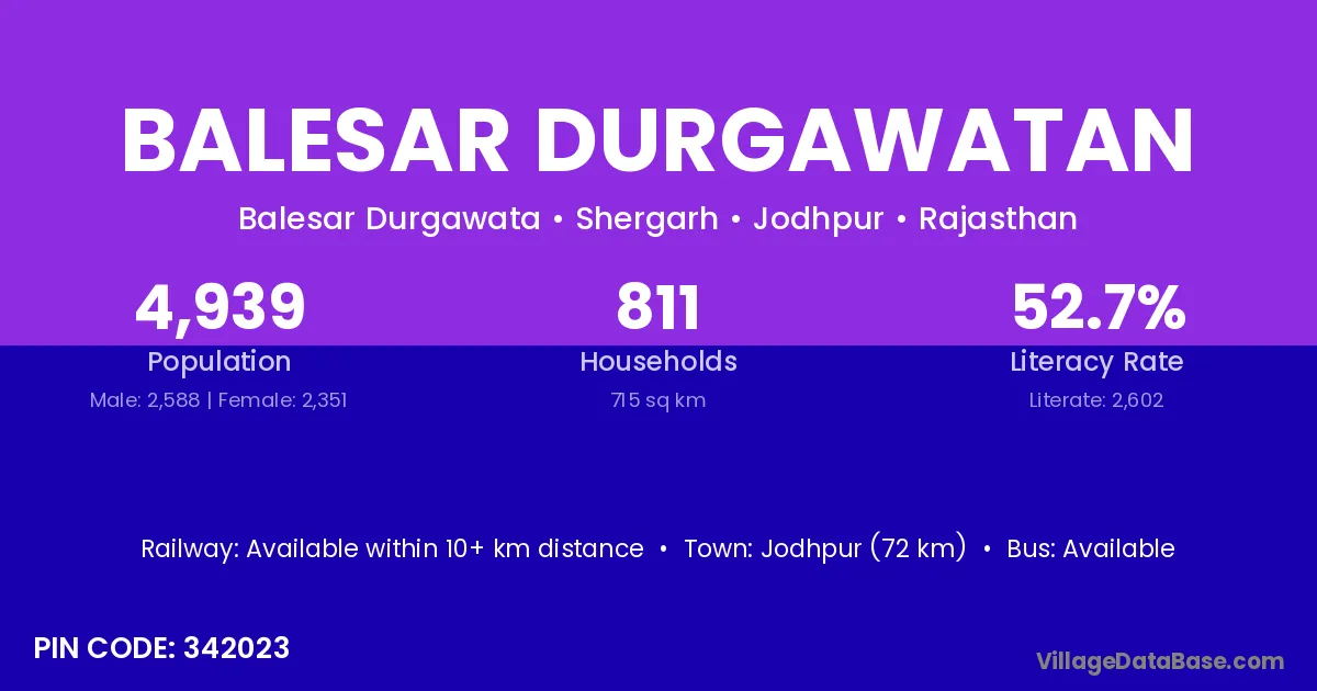 Jodhpur (72 km) is the nearest town to Balesar Durgawatan village for major economic activities and is located approximately 72 km away.