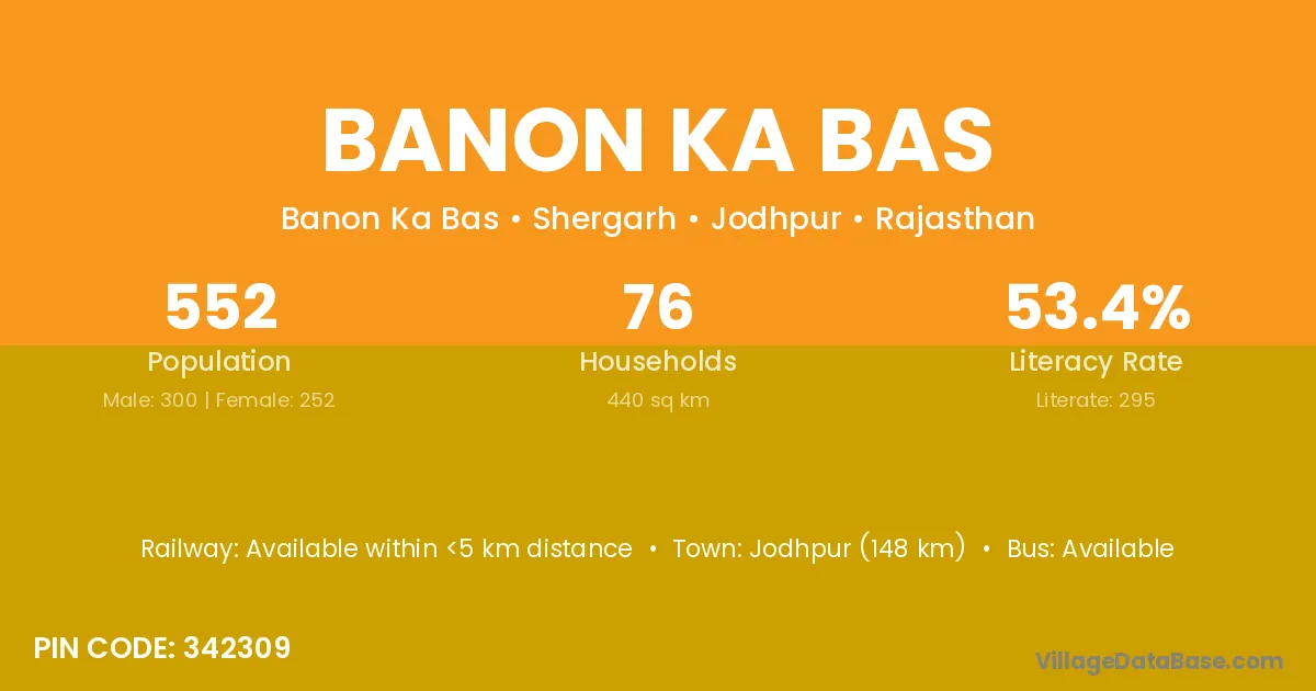 Banon Ka Bas village has a total population of 552 people, of which 300 are males and 252 are females.