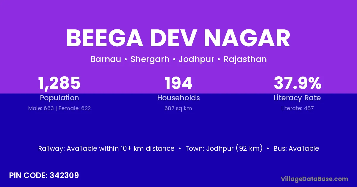Jodhpur (92 km) is the nearest town to Beega Dev Nagar village for major economic activities and is located approximately 92 km away.