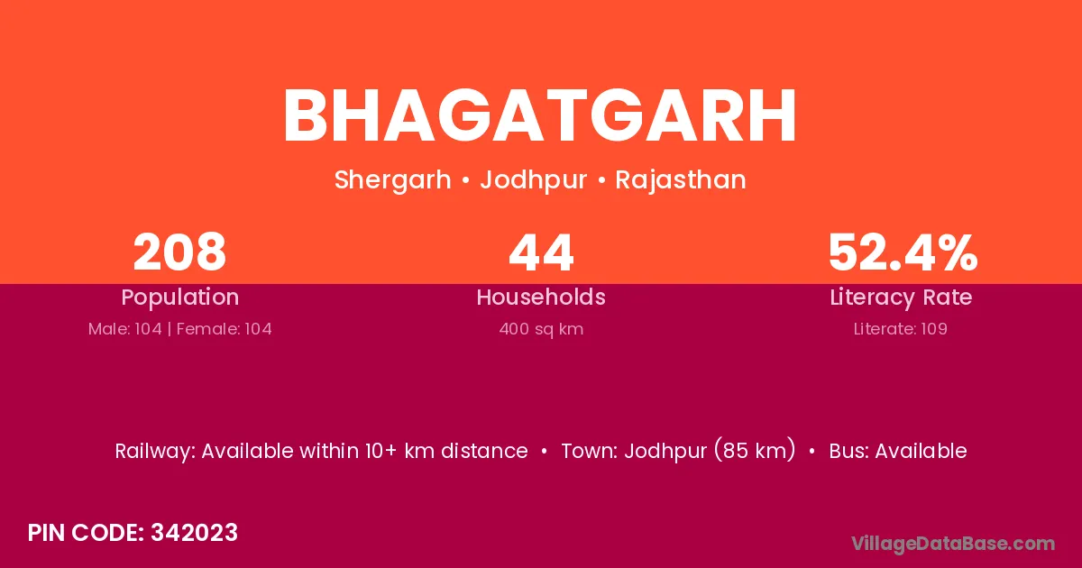 Jodhpur (85 km) is the nearest town to Bhagatgarh village for major economic activities and is located approximately 85 km away.