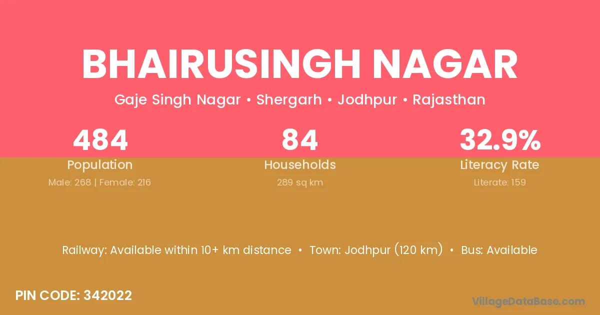 Jodhpur (120 km) is the nearest town to Bhairusingh Nagar village for major economic activities and is located approximately 120 km away.