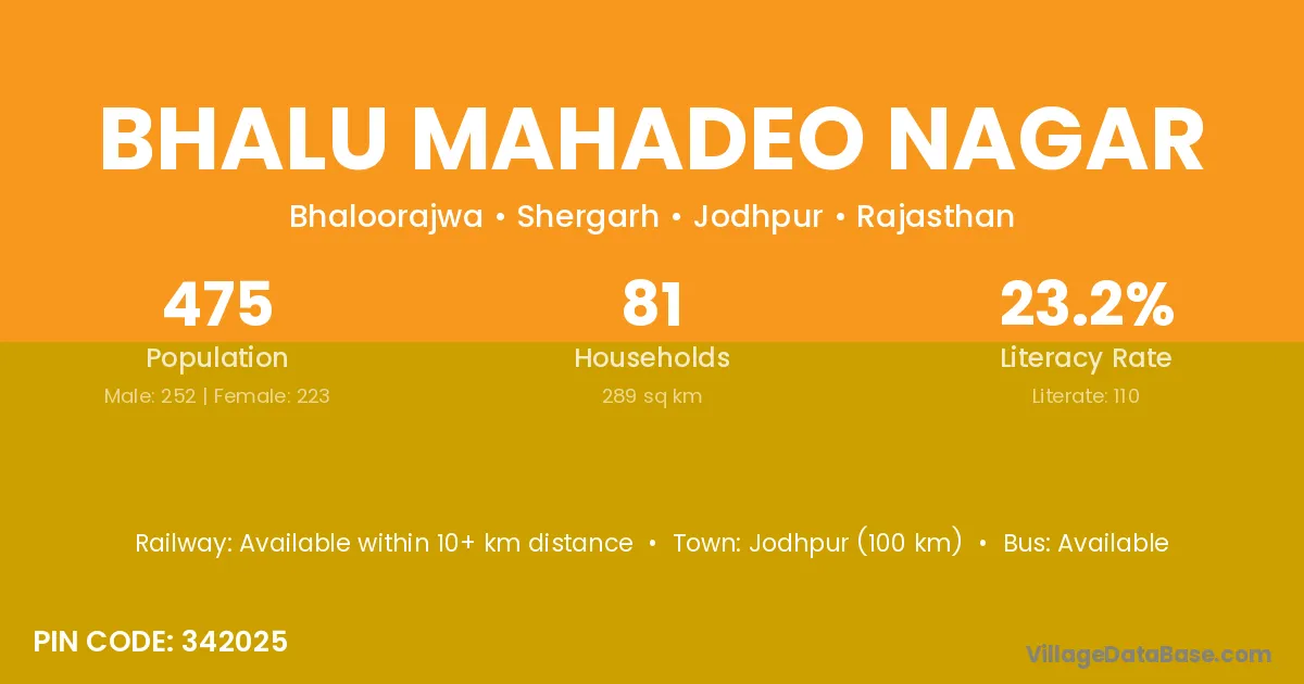 Jodhpur (100 km) is the nearest town to Bhalu Mahadeo Nagar village for major economic activities and is located approximately 100 km away.