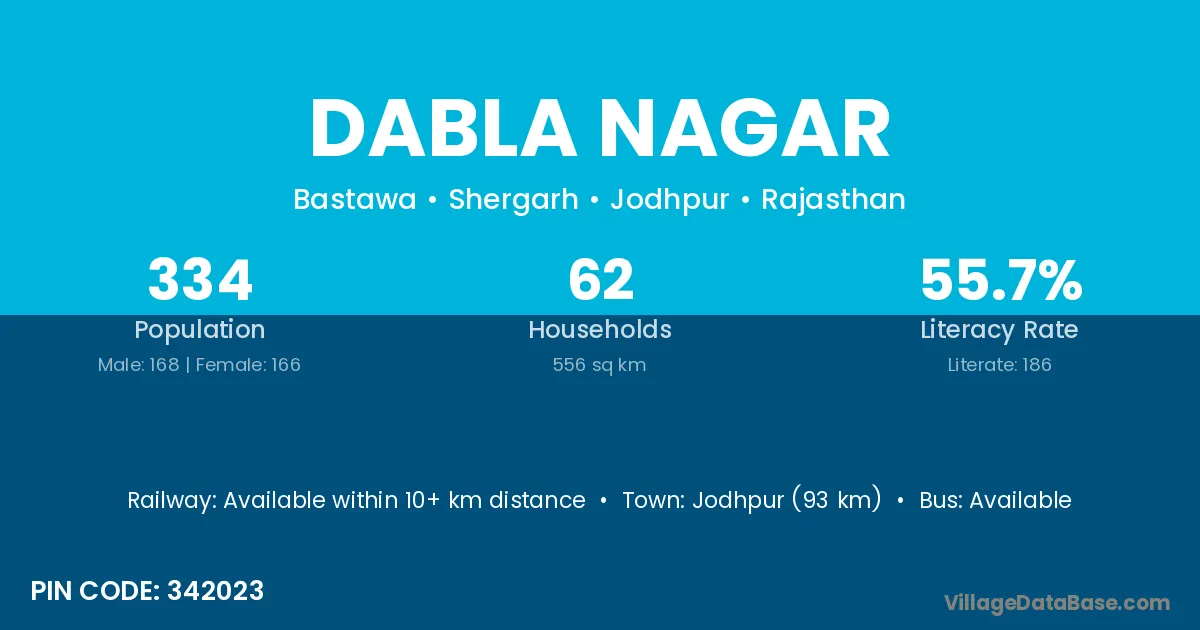 Jodhpur (93 km) is the nearest town to Dabla Nagar village for major economic activities and is located approximately 93 km away.