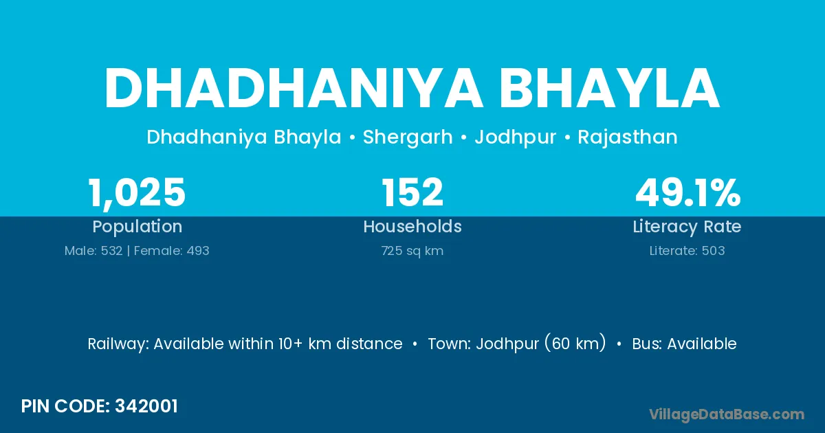 Jodhpur (60 km) is the nearest town to Dhadhaniya Bhayla village for major economic activities and is located approximately 60 km away.