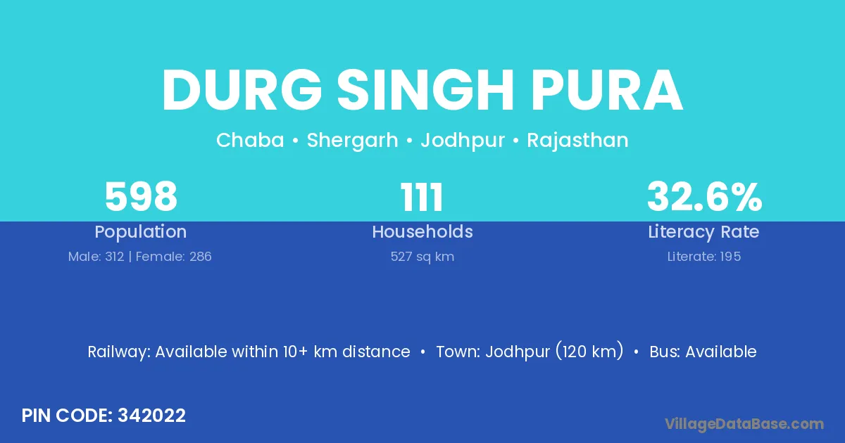 Jodhpur (120 km) is the nearest town to Durg Singh Pura village for major economic activities and is located approximately 120 km away.