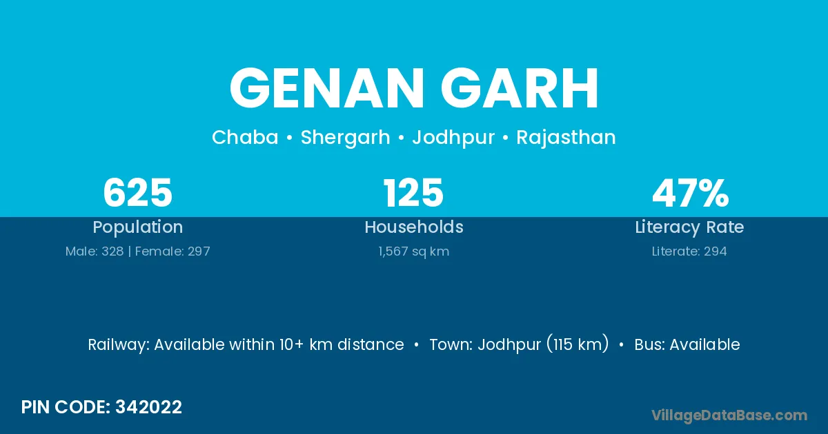 Jodhpur (115 km) is the nearest town to Genan Garh village for major economic activities and is located approximately 115 km away.